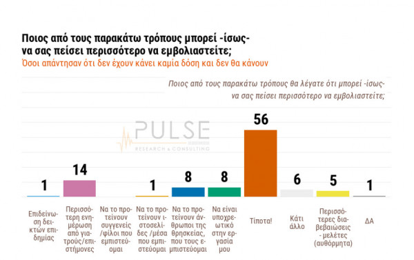 Όσο για τους τρόπους, με τους οποίους θα μπορούσαν να πειστούν προκειμένου να εμβολιαστούν, αξιοσημείωτο είναι το γεγονός ότι μόλις το 1% των ερωτηθέντων απαντά ότι θα πειθόταν από την επιδείνωση των δεικτών της πανδημίας, με ένα 14% να απαντά πως θα έλεγε «ναι» στο εμβόλιο αν είχε περισσότερη ενημέρωση από γιατρούς/επιστήμονες. Υπάρχει, ωστόσο, και ένα 8%, που απάντησε πως θα το σκεφτόταν εάν το προτείνουν… άνθρωποι της θρησκείας που εμπιστεύονται.