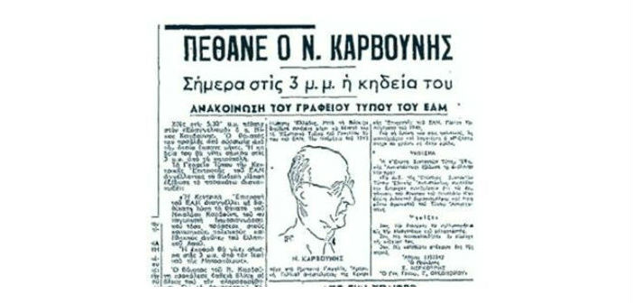 Ο Νίκος Καρβούνης – ποιητής, κριτικός, στοχαστής, δημοσιογράφος – γεννήθηκε στην Ιθάκη το 1880. Άφησε την τελευταία του πνοή στο νοσοκομείο «Ευαγγελισμός» στις 5.30 το απόγευμα της 17ης Φλεβάρη 1947, εξαιτίας της ουραιμίας η οποία τον ταλαιπώρησε για μήνες.