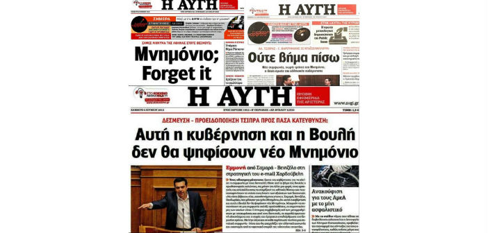 Ήταν επίσης ο ίδιος ο Αλ. Τσίπρας που από το βήμα της Βουλής, στις 26 Ιούνη 2015, διακήρυτε πως «αυτή η κυβέρνηση και αυτή η Βουλή δεν πρόκειται να ψηφίσει νέο μνημόνιο».
