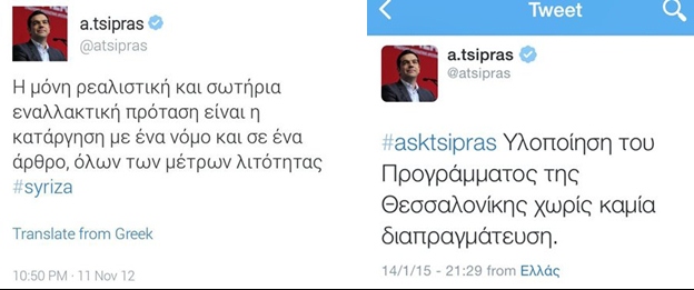 - Η μόνη ρεαλιστική και σωτήρια εναλλακτική πρόταση είναι η κατάργηση με έναν νόμο και ένα άρθρο όλων των μέτρων λιτότητας. Α. Τσίπρας στο Twitter, 11 Νοέμβρη 2012.