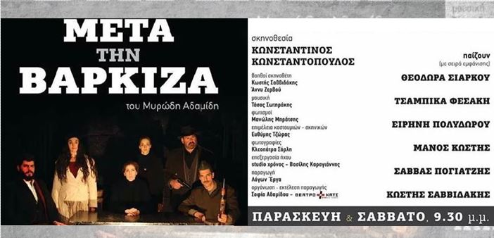 Η παράσταση «Μετά την Βάρκιζα» του Μυρώδη Αδαμίδη, σε σκηνοθεσία Κωνσταντίνου Κωνσταντόπουλου, επιστρέφει για 2η χρονιά στο θέατρο Αλκμήνη από την Παρασκευή 6 Οκτωβρίου 2017, και κάθε Παρασκευή και Σάββατο στις 21:30, τηλέφωνα κρατήσεων & πληροφορίες : 210 3428650 & 6978603947.