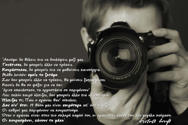 Η μαρτυρία του Λευτέρη Πιταράκη, ανταποκριτή του Associated Press και μαθητή του Γιάννη Μπεχράκη, φωτίζει τη δουλειά των φωτορεπόρτερ, τις προσωπικές τους δεσμεύσεις και την υπερπροσπάθεια που απαιτείται στα πεδία των μαχών και των συγκρούσεων όπου καραδοκεί πάντα το μοιραίο.