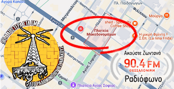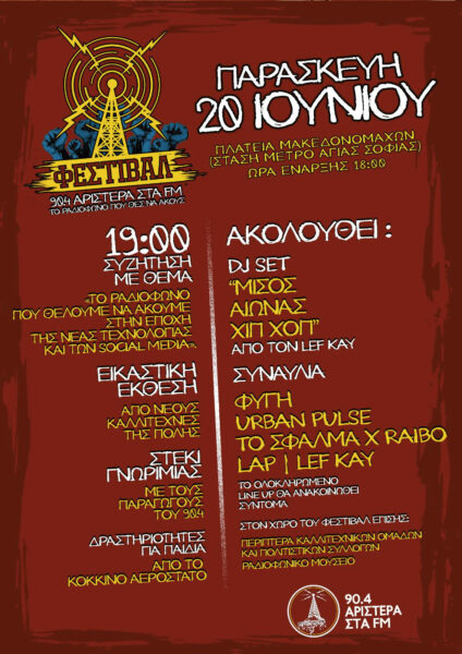 Την Παρασκευή 20 Ιούνη, θα πραγματοποιηθεί το 1ο Φεστιβάλ του «90,4 Αριστερά στα FM», ο οποίος ανοίγει τα μικρόφωνα του, στην καρδιά της πόλης της Θεσσαλονίκης, στην Πλατεία Μακεδονομάχων (στάση μετρό Αγίας Σοφίας) από τις 6 μ.μ.
