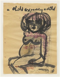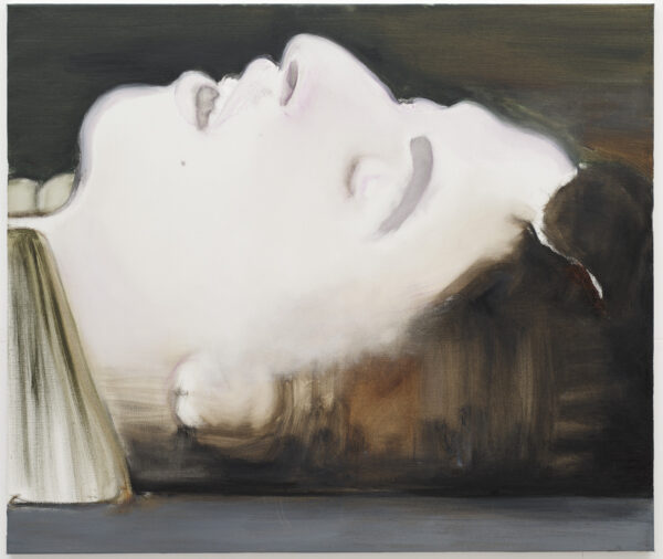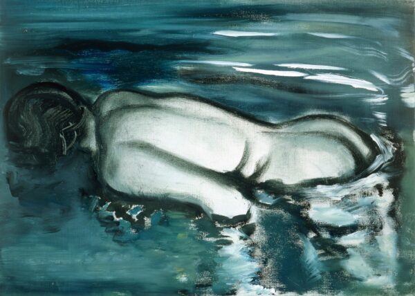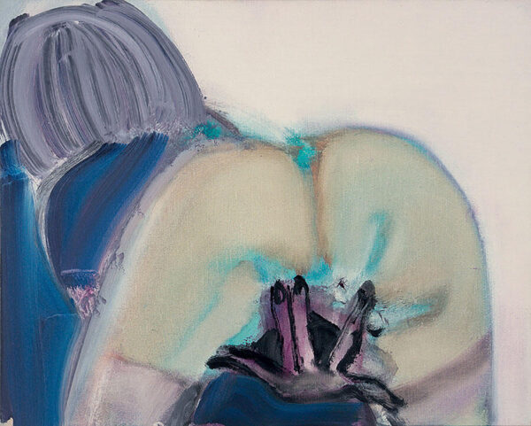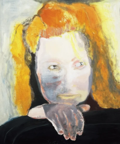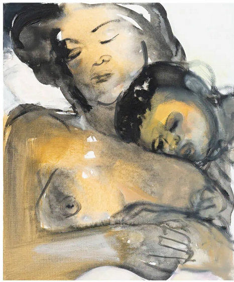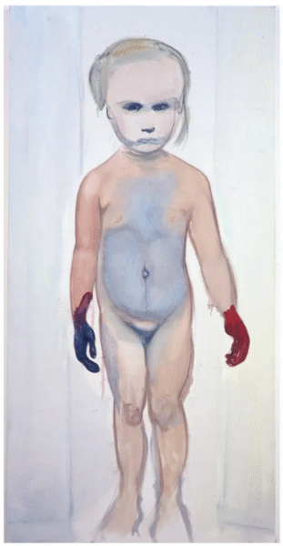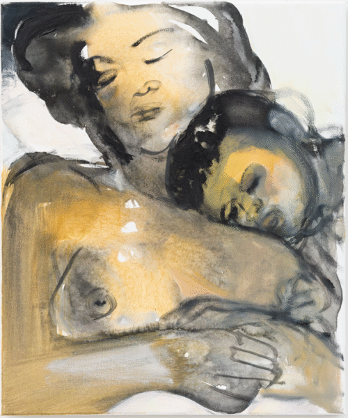 Αλλά η θνητότητα δεν είναι το μόνο θέμα που εκτίθεται εδώ. Όπως υποδηλώνει ο τίτλος της έκθεσης, η ζωή είναι ένας κύκλος και, για την Dumas, η γήρανση και ο θάνατος είναι άρρηκτα συνυφασμένα με την αγάπη, το σεξ, τη γέννηση και την επιθυμία. Το “Δερμάτινες Μπότες” (2002), ένα ακτινοβόλο πορτρέτο μιας γυμνής χορεύτριας στο Άμστερνταμ με οπίσθιο φωτισμό, είναι μόνο ένα από τα πολλά ερωτικά θέματα που κυριαρχούν στο έργο της, ενώ το “Έλενα και Εδέμ” (2020) είναι ένα πορτρέτο της κόρης και του νεαρού εγγονού της καλλιτέχνιδας. Στην “Έλενα” (1992), τον πρώτο πίνακα της έκθεσης, η κόρη της εμφανίζεται ξανά, αυτή τη φορά ως παιδί. Το έντονα εστιασμένο βλέμμα της θυμίζει την αφοβία της νεότητας καθώς αντιμετωπίζει τον θεατή με μια έκφραση σκεπτικιστικής περιφρόνησης παρόμοια με αυτή που βλέπουμε στον πίνακα “Ζωγράφος”.