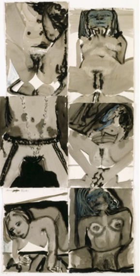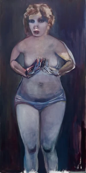 Η Marlene Dumas είναι γνωστή για την εξερεύνηση θεμάτων οικειότητας, σεξουαλικότητας και ανθρώπινης μορφής στους πίνακές της, συχνά απεικονίζοντας γυναίκες με θηλές και αιδοία ως μέρος του εικαστικού της έργου. Η τέχνη της συχνά αναφέρεται σε ιστορικές και σύγχρονες εικόνες, συμπεριλαμβανομένης της ιστορίας της τέχνης, των μέσων μαζικής ενημέρωσης και των προσωπικών φωτογραφιών, τις οποίες χρησιμοποιεί για να εξετάσει την ανθρώπινη ευαλωτότητα και το συναίσθημα. Οι πίνακες της Dumas δεν είναι απλώς απεικονίσεις γυμνού, αλλά εμβαθύνουν επίσης στα ψυχολογικά και κοινωνικά πλαίσια που περιβάλλουν το ανθρώπινο σώμα. Στο έργο μου “Δεσποινίς Ιανουάριος” (1997), ο θεατής βρίσκεται αντιμέτωπος με μια μνημειώδη γυναικεία φιγούρα, ύψους τριών μέτρων, γυμνή από τη μέση και κάτω, με πρόσωπο σαν πούδρα, βαθύ κόκκινο κραγιόν και μάτια μουτζουρωμένα kohl-smudged. Η τολμηρή στάση contrapposto της, με τα χέρια στους γοφούς τους αγκώνες λυγισμένους προς τα έξω _akimbo σε μια δυναμική προκλητική στάση, με τα πόδια σε κάμψη, ακτινοβολεί ισότιμα μέρη αδιαφορίας και ανυπακοής, σαν να μας προκαλεί να κάνουμε οποιεσδήποτε υποθέσεις γι’ αυτήν. Συνδυάζοντας μια επίσημη μαεστρία με χαλαρό, εκφραστικό πινέλο, μια εντυπωσιακή χρήση χρώματος, διακριτικό ψυχολογικό βάθος και μια υγιή δόση πρόκλησης, είναι ένα από τα κορυφαία παραδείγματα του έργου της καλλιτέχνιδας.