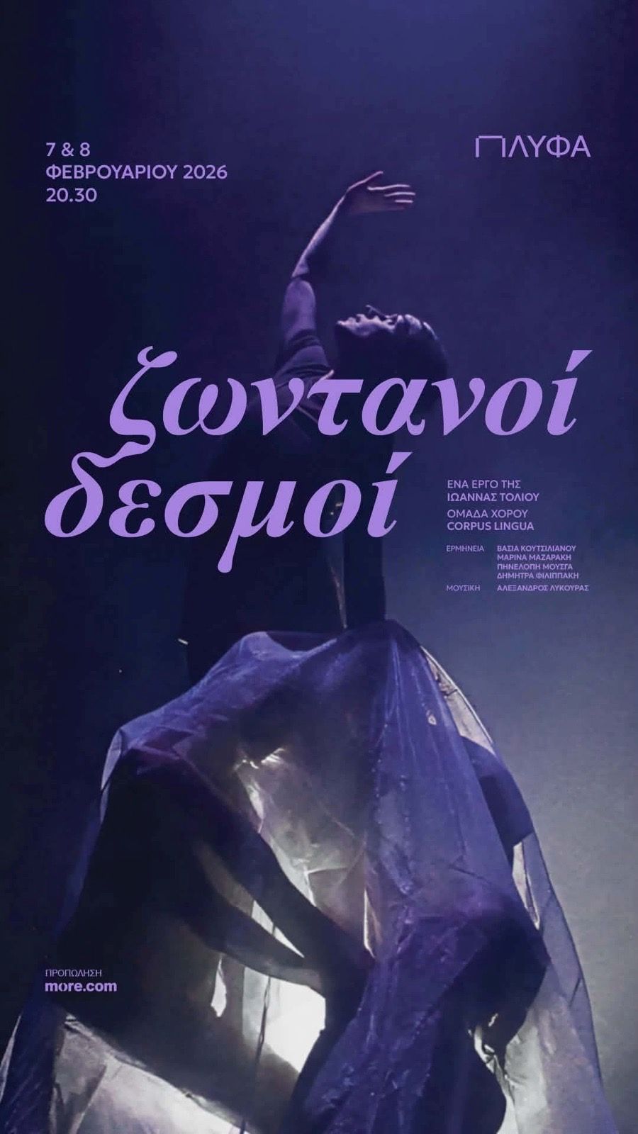 Με τη σύγχρονη χορευτική δημιουργία «Ζωντανοί δεσμοί» η ομάδα χορού Corpus Lingua χαρτογραφεί τη σχέση μητέρας-παιδιού και την πορεία του ατόμου προς την ανεξαρτησία, διερευνώντας πώς οι πρώιμοι συναισθηματικοί δεσμοί επηρεάζουν τη διαμόρφωση της προσωπικότητας και τις σχέσεις στην ενήλικη ζωή.