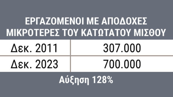 Αξίζει να σημειωθεί ότι σε απόλυτους αριθμούς, αμοιβή χαμηλότερη από τον κατώτατο μισθό τον Δεκέμβρη του 2011 έπαιρναν σχεδόν 307.000 εργαζόμενοι ενώ τον Δεκέμβρη του 2023 έπαιρναν 700.000 εργαζόμενοι. Αύξηση 128%!