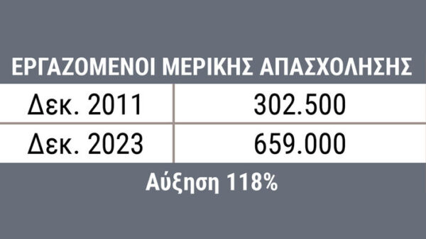 Τέλος, τα στοιχεία επιβεβαιώνουν τη γενίκευση της μερικής απασχόλησης: Το 2011 οι μισθωτοί με μερική απασχόληση ήταν 302.500 και το 2023 ήταν υπερδιπλάσιοι, περίπου 659.000. Αύξηση 118%!