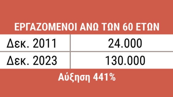 Έτσι, οι εργαζόμενοι άνω των 60 ετών τον Δεκέμβρη του 2011 έφταναν σχεδόν τους 24.000 για να αυξηθούν κατακόρυφα μέχρι τον Δεκέμβρη του 2023 στους 130.000. Αύξηση 441%!