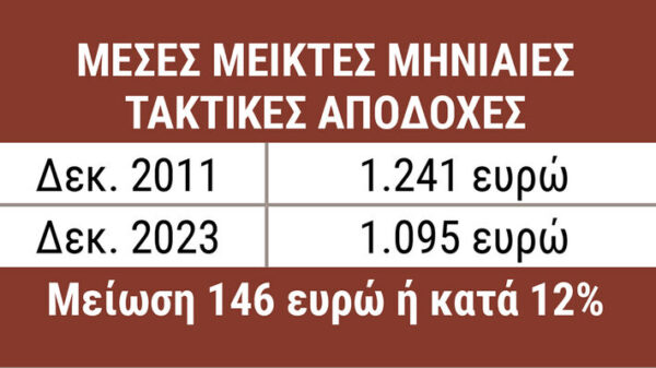 – Οι μέσες μηνιαίες τακτικές αποδοχές τον Δεκέμβρη του 2011 ήταν 1.241 ευρώ μεικτά(1). Τον Δεκέμβρη του 2023 είναι μόλις 1.095 ευρώ μεικτά(2).