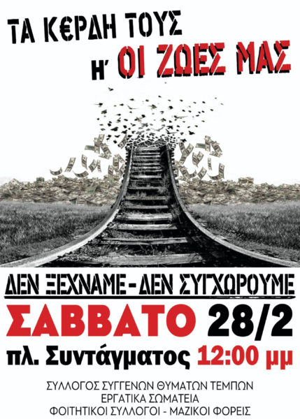 - 28 ΦΛΕΒΑΡΗ – 3 ΧΡΟΝΙΑ ΑΠΟ ΤΟ ΕΓΚΛΗΜΑ ΤΩΝ ΤΕΜΠΩΝ. Ολοι στη μάχη για τα παλλαϊκά συλλαλητήρια και τις απεργίες! Σύγκρουση παντού με την πολιτική του κέρδους, που απειλεί τις ζωές και συνθλίβει τις ανάγκες μας.
