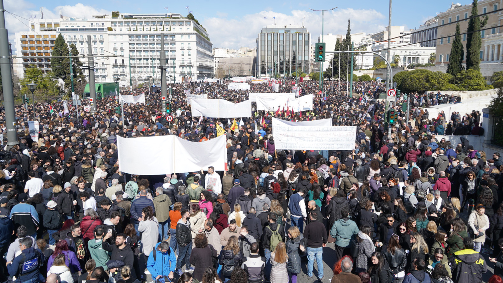 Μεγαλειώδες συλλαλητήριο στην Αθήνα με το Σύνταγμα να πλημμυρίζει με χιλιάδες λαού στέλνοντας μήνυμα ότι η μαζική συμμετοχή δεν είναι μόνο φόρος τιμής στους νεκρούς και στους συγγενείς τους, αλλά κυρίως χρέος αγώνα στις σημερινές και αυριανές γενιές, αφού η πολιτική που οδήγησε στα Τέμπη είναι εδώ.
