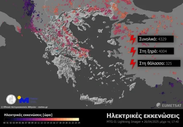 Τοπικές βροχές και καταιγίδες εκδηλώθηκαν σε μεγάλο μέρος της χώρας το Σάββατο (26/4) με έμφαση τα κεντρικά και βόρεια ηπειρωτικά _Η ανάλυση δεδομένων από τον Ευρωπαϊκό μετεωρολογικό δορυφόρο τρίτης γενιάς Meteosat-12 και το Lightning Imager (LI) όργανο που φέρει, έδειξε ότι μέχρι τις 17:40 του Σαββάτου 26/04 έχουν καταγραφεί περισσότερες από 4.000 ηλεκτρικές εκκενώσεις, με τις περισσότερες να καταγράφονται στα ανατολικά και βόρεια ηπειρωτικά τμήματα, όπως διακρίνεται και στον παρακάτω χάρτη.