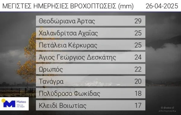 Σύμφωνα με το δίκτυο αυτόματων μετεωρολογικών σταθμών του Εθνικού Αστεροσκοπείου Αθηνών / meteo.gr, έως τις 17:40 του Σαββάτου 26/4, το μεγαλύτερο ύψος βροχής καταγράφηκε στο μετεωρολογικό σταθμό στα Θεοδώριανα Άρτας και ήταν ίσο με 29 mm, ενώ τοπικά σημαντικά ύψη βροχής καταγράφηκαν και στη Βόρεια Πελοπόννησο και στην Κέρκυρα με τα μεγαλύτερα ύψη βροχής να σημειώνονται στους μετεωρολογικούς σταθμούς στην Χαλανδρίτσα Αχαΐας και στην Πετάλεια Κέρκυρας με 25 mm.