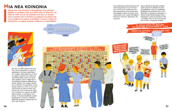 Ένα βιβλίο γεμάτο χρώμα! Μια ιδιαίτερα προσεγμένη έκδοση που καταφέρνει να αιχμαλωτίσει την καρδιά και τον νου των μικρών, αλλά και των μεγαλύτερων αναγνωστών… που μιλά γεμάτο ζωντάνια για τη «Χώρα του Αύριο», τη χώρα που οικοδομήθηκε πριν από έναν αιώνα, την ΕΣΣΔ. Ένας “άτλαντας μιας χώρας που έκανε όνειρα και εδραιώθηκε πριν από 100 χρόνια…”. Με “οδηγό” την τέχνη του κονστρουκτιβισμού, του κύριου μετα – επαναστατικού καλλιτεχνικού ρεύματος στη Σοβιετική Ένωση, το βιβλίο με γοητευτικό και ζωντανό τρόπο “διασχίζει” τη “Χώρα του Αύριο”, το πρώτο εργατικό κράτος του κόσμου, εκεί όπου τέθηκαν οι βάσεις για την κατάργηση της εκμετάλλευσης ανθρώπου από άνθρωπο. Τότε που “ένα νέο, πρωτοφανές οικοδόμημα χτίστηκε με γνώμονα τις ανάγκες της καθημερινής ζωής και θεμελιώθηκε με μόχθο προς το συμφέρον του Ανθρώπου”.