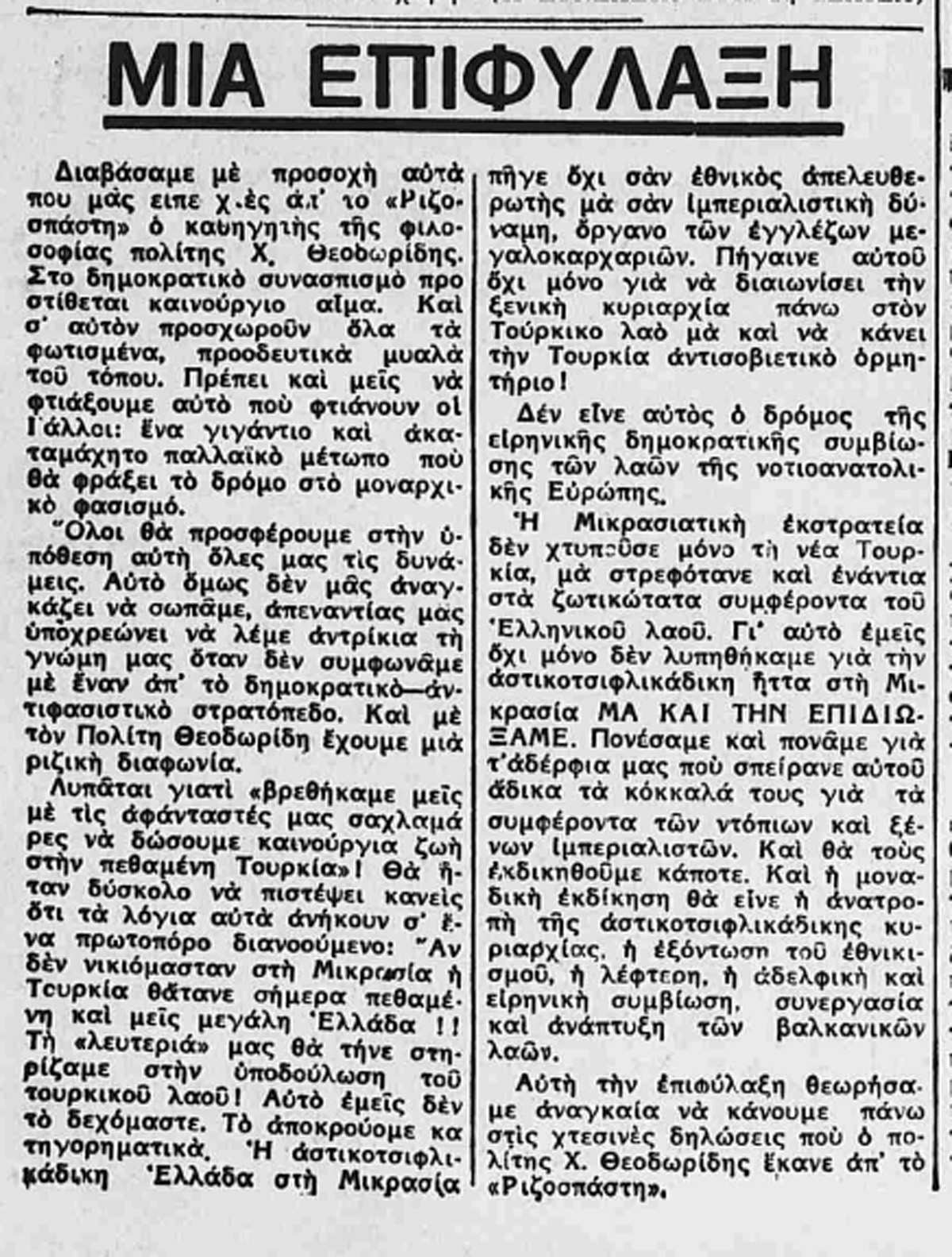 Η Μικρασιατική εκστρατεία δεν χτυπούσε μόνο τη νέα Τουρκία, μα στρεφότανε και ενάντια στα ζωτικότατα συμφέροντα του Ελληνικού λαού. Γι’αυτό εμείς όχι μόνο δεν λυπηθήκαμε για τη αστικοτσιφλικάδικη ήττα στη Μικρασία. ΜΑ ΚΑΙ ΤΗΝ ΕΠΙΔΙΩΞΑΜΕ. Πονέσαμε και πονάμε για τα’ αδέρφια μας που σπείρανε αυτού άδικα τα κόκκαλά τους για τα συμφέροντα των ντ΄πιων και ξένων ιμπεριαλιστών. Και θα τους εκδικηθούμε κάποτε. Και η μοναδικής εκδίκηση θα είνε η ανατροπή της αστικοτσιφλικάδικης κυριαρχίας, η εξόντωση του εθνικισμού, η λέφτερη, η αδελφική και ειρηνική συμβίωση, η συνεργασία και ανάπτυξη των βαλκανικών λαών.