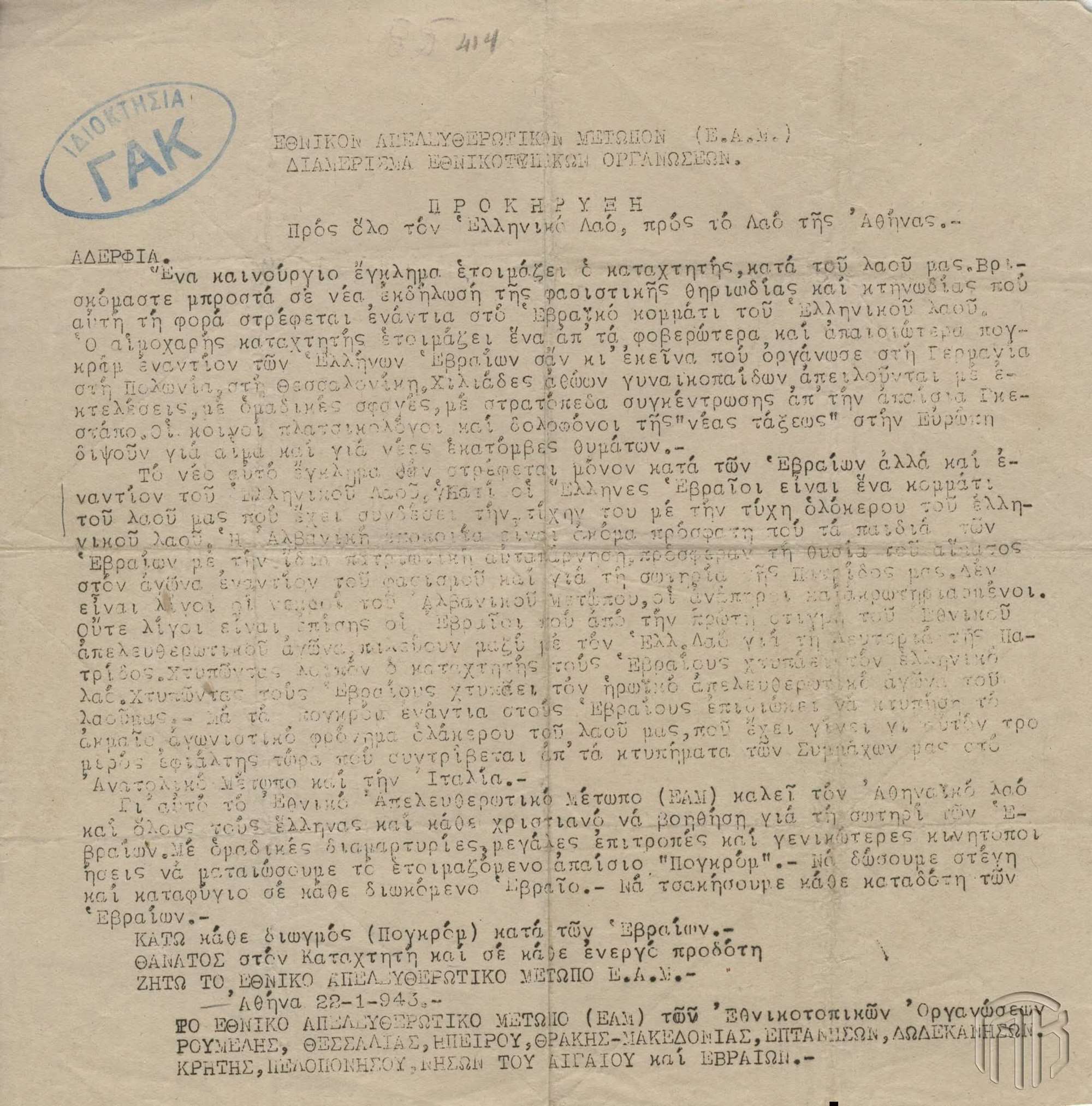 Γι’ αυτό το Εθνικό Απελευθερωτικό Μέτωπο καλεί τον Αθηναϊκό λαό και όλους τους Έλληνες και κάθε χριστιανό να βοηθήση για τη σωτηρία των Εβραίων. Με ομαδικές διαμαρτυρίες, μεγάλες επιτροπές και γενικότερες κινητοποιήσεις να ματαιώσουμε το ετοιμαζόμενο απαίσιο «πογκρόμ». Να δώσουμε στέγη και καταφύγιο σε κάθε διωκόμενο Εβραίο. Να τσακήσουμε κάθε καταδότη των Εβραίων.