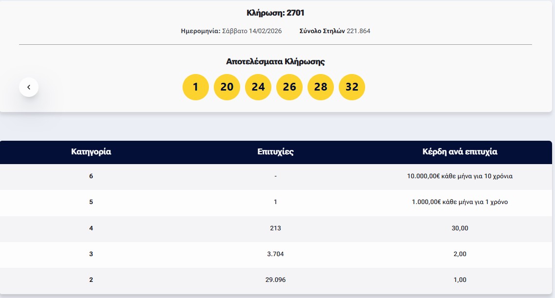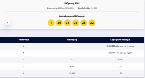Κλήρωση ΛΟΤΤΟ 14/2/2026 – Κλήρωση 2701: Στην κλήρωση 2701 του ΛΟΤΤΟ δε βρέθηκε νικητής στην 1η κατηγορία όμως στη 2η κατηγορία, βρέθηκε 1 5άρι που κέρδισε 1.000 ευρώ το μήνα.