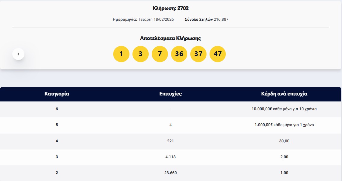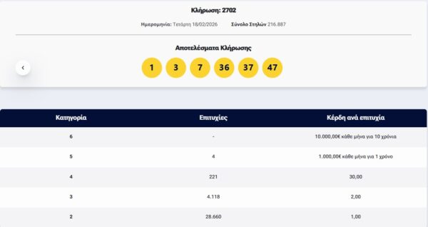 Κλήρωση ΛΟΤΤΟ 18/2/2026 – Κλήρωση 2702: Στην κλήρωση 2702 του ΛΟΤΤΟ δε βρέθηκε νικητής στην 1η κατηγορία όμως στη 2η κατηγορία, βρέθηκan 4 5άρια που κέρδισαν 1.000 ευρώ το μήνα.