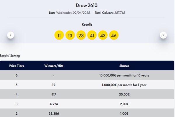 Κλήρωση ΛΟΤΤΟ 2/4/2025 – Κλήρωση 2610: Στην κλήρωση της 2610 του ΛΟΤΤΟ δε βρέθηκε νικητής στην 1η κατηγορία. Στη 2η κατηγορία 5άρι βρέθηκαν δώδεκα (12 τυχερά δελτία που κερδίζουν 1.000€ το μήνα για 1 χρόνο.