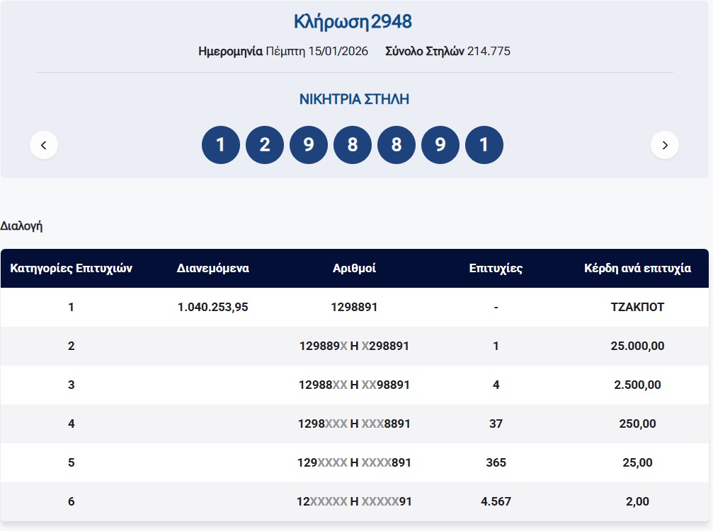 Κλήρωση ΠΡΟΤΟ 15/1/2026 – Κλήρωση 2948: €1.040.000 τουλάχιστον θα μοιραστούν οι τυχεροί της 1ης κατηγορίας στην κλήρωση της Τρίτης 15/1/2026 μετά το ΤΖΑΚ-ΠΟΤ που σημειώθηκε κατά την προηγούμενη διαλογή της 2947ης κλήρωσης του ΠΡΟΤΟ