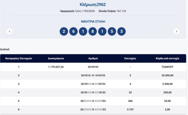 Κλήρωση ΠΡΟΤΟ 17/2/2026 – Κλήρωση 2962: €1.180.000 τουλάχιστον θα μοιραστούν οι τυχεροί της 1ης κατηγορίας στην κλήρωση της Τρίτης 17/2/2026 μετά το ΤΖΑΚ-ΠΟΤ που σημειώθηκε κατά τη διαλογή της 2961ης κλήρωσης του ΠΡΟΤΟ