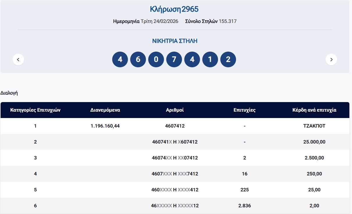 Κλήρωση ΠΡΟΤΟ 24/2/2026 – Κλήρωση 2965: €1.200.000 τουλάχιστον θα μοιραστούν οι τυχεροί της 1ης κατηγορίας στην κλήρωση της Τρίτης 24/2/2026 μετά το ΤΖΑΚ-ΠΟΤ που σημειώθηκε κατά τη διαλογή της 2964ης κλήρωσης του ΠΡΟΤΟ