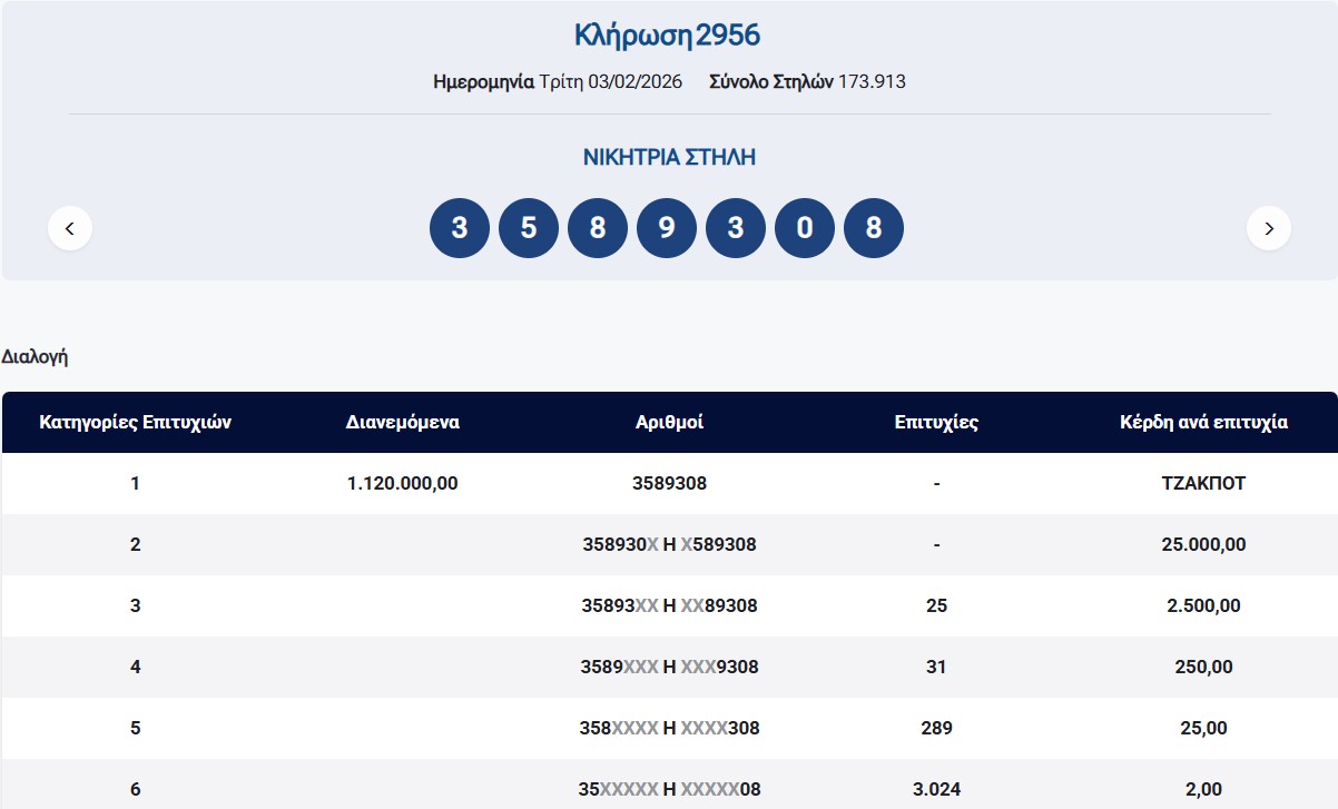 Κλήρωση ΠΡΟΤΟ 3/2/2026 – Κλήρωση 2956: €1.120.000 τουλάχιστον θα μοιραστούν οι τυχεροί της 1ης κατηγορίας στην κλήρωση της Τρίτης 3/2/2026 μετά το ΤΖΑΚ-ΠΟΤ που σημειώθηκε κατά την προηγούμενη διαλογή της 2955ης κλήρωσης του ΠΡΟΤΟ