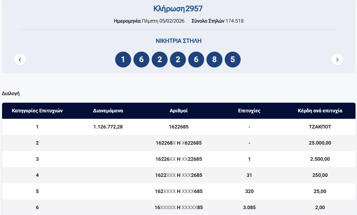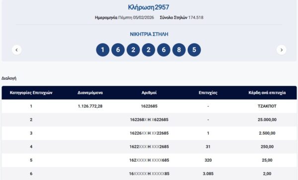 Κλήρωση ΠΡΟΤΟ 5/2/2026 – Κλήρωση 2957: €1.130.000 τουλάχιστον θα μοιραστούν οι τυχεροί της 1ης κατηγορίας στην κλήρωση της Πέμπτης 5/2/2026 μετά το ΤΖΑΚ-ΠΟΤ που σημειώθηκε κατά την προηγούμενη διαλογή της 2956ης κλήρωσης του ΠΡΟΤΟ