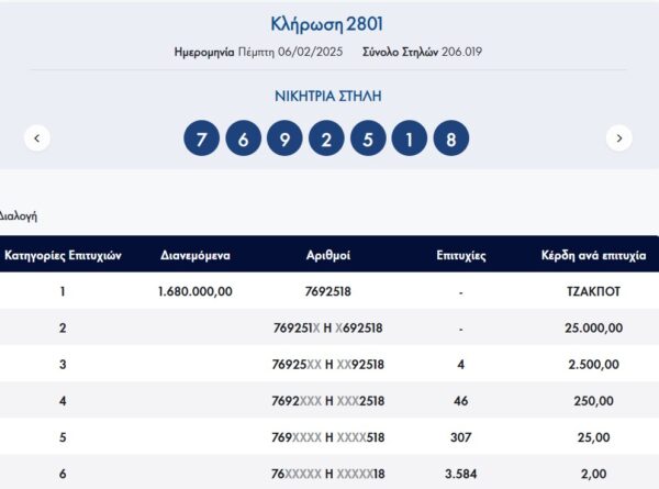 Κλήρωση ΠΡΟΤΟ 6/2/2025 – Κλήρωση 2801: €1.660.000 τουλάχιστον θα μοιραστούν οι τυχεροί της 1ης κατηγορίας στην κλήρωση της Πέμπτης 6/2/2025 μετά το ΤΖΑΚ-ΠΟΤ που σημειώθηκε κατά την προηγούμενη διαλογή της 2800ης κλήρωσης του ΠΡΟΤΟ