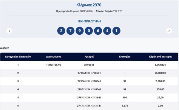 Κλήρωση ΠΡΟΤΟ 5/3/2026 – Κλήρωση 2979: €1.240.000 τουλάχιστον θα μοιραστούν οι τυχεροί της 1ης κατηγορίας στην κλήρωση της Κυριακής 5/3/2026 μετά το ΤΖΑΚ-ΠΟΤ που σημειώθηκε κατά τη διαλογή της 2968ης κλήρωσης του ΠΡΟΤΟ
