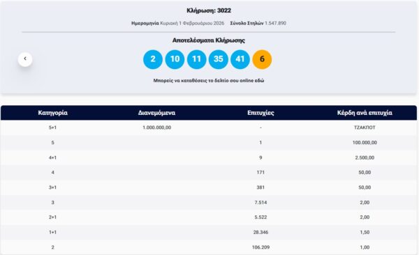 Κλήρωση Τζόκερ 1/2/2026- Κλήρωση 3022: Μετά το τζακ ποτ στην προηγούμενη κλήρωση του ΤΖΟΚΕΡ €1.000.000 τουλάχιστον θα μοιραστούν οι τυχεροί της 1ης κατηγορίας στην κλήρωση της Πέμπτης 29/1/2026.