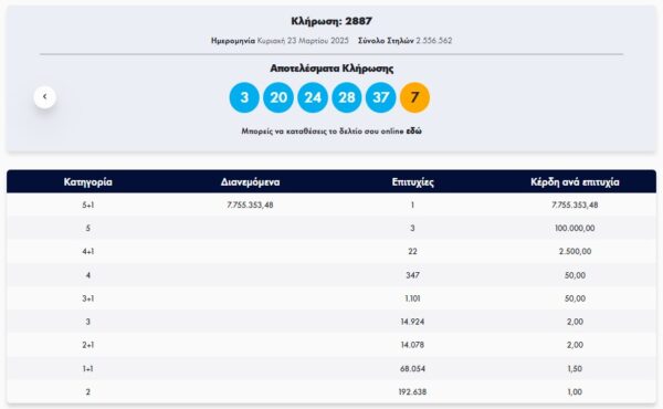 Κλήρωση Τζόκερ 233/2025- Κλήρωση 2887: Μετά από το τζακ ποτ της προηγούμενης κλήρωσης του ΤΖΟΚΕΡ €7.700.000 τουλάχιστον θα μοιραστούν οι τυχεροί της 1ης κατηγορίας στην σημερινή κλήρωση της κυριακής 23/3/2025.