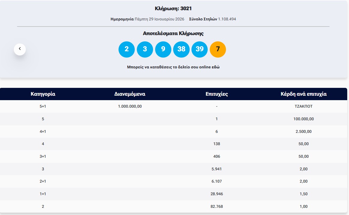 Κλήρωση Τζόκερ 29/1/2026- Κλήρωση 3021: Μετά το τζακ ποτ στην προηγούμενη κλήρωση του ΤΖΟΚΕΡ €1.000.000 τουλάχιστον θα μοιραστούν οι τυχεροί της 1ης κατηγορίας στην κλήρωση της Πέμπτης 29/1/2026.