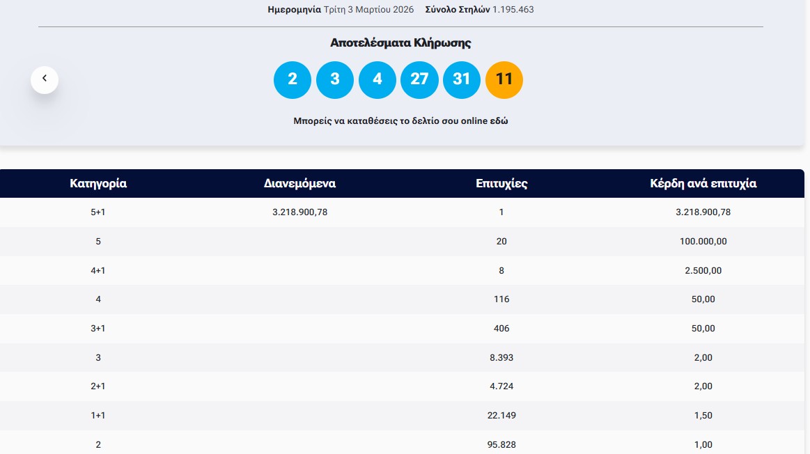 Κλήρωση Τζόκερ 3/3/2026- Κλήρωση 3036: Μετά το τζακ ποτ στην προηγούμενη κλήρωση του ΤΖΟΚΕΡ €3.200.000 τουλάχιστον θα μοιραστούν οι τυχεροί της 1ης κατηγορίας στην κλήρωση της Τρίτης 3/3/2026.