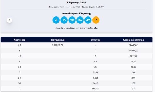 Κλήρωση Τζόκερ 7/1/2025- Κλήρωση 2855: Μετά από το τζακ ποτ της προηγούμενης κλήρωσης του ΤΖΟΚΕΡ €9.500.000 τουλάχιστον θα μοιραστούν οι τυχεροί της 1ης κατηγορίας στην σημερινή κλήρωση της Κυριακής 7/1/2025.