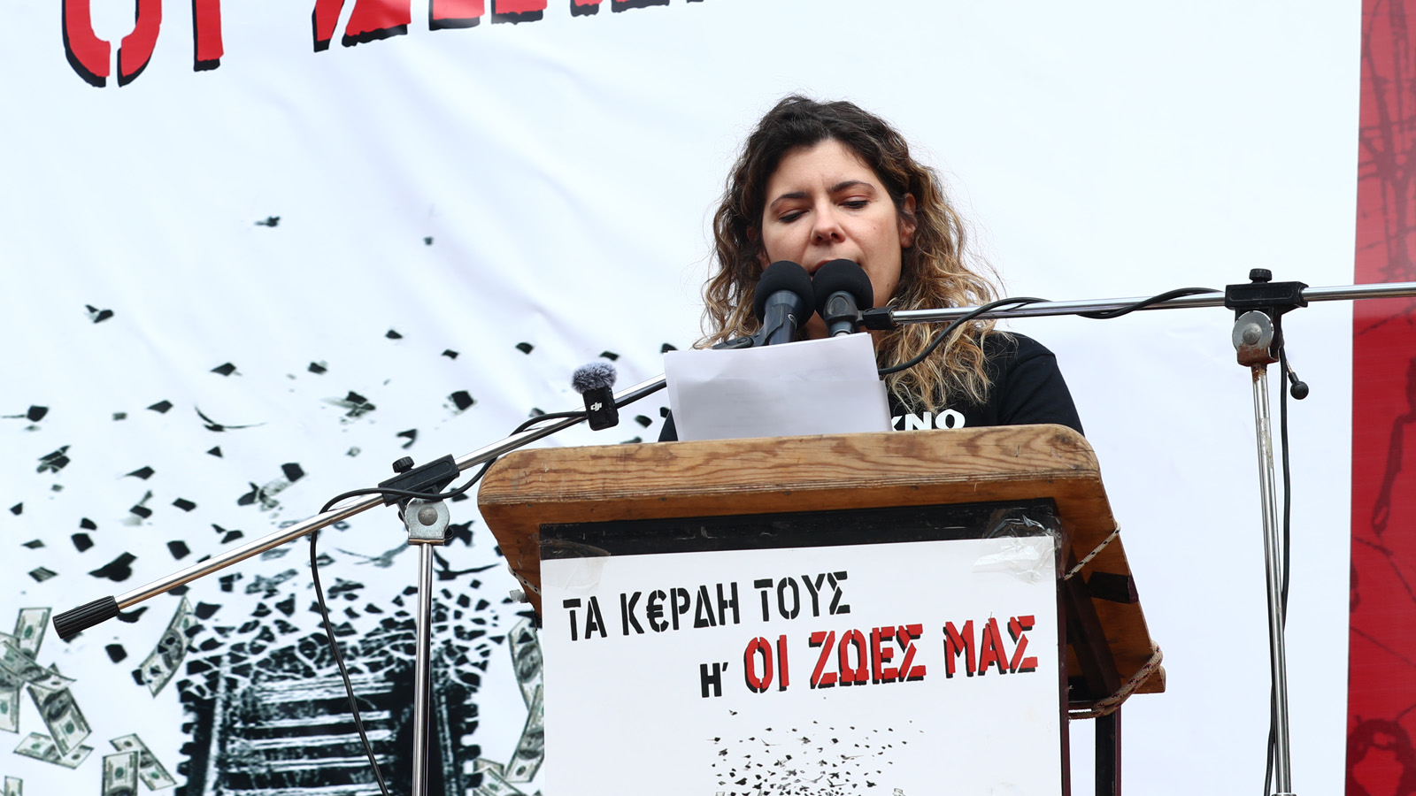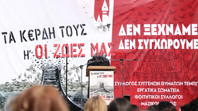(…) Είμαστε σήμερα στο δρόμο γιατί η εγκληματική πολιτική που δολοφόνησε τους 57 δικούς μας ανθρώπους είναι εδώ! Και γεννά νέα Τέμπη! Είναι εδώ η πολιτική του κέρδους, η διαβόητη “κανονικότητα” της ΕΕ, που γεννά παντού νέες, αμέτρητες κοιλάδες θανάτου.