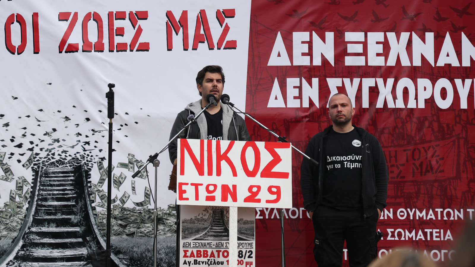 «Η μεγάλη σημερινή απεργιακή συγκέντρωση είναι η καλύτερη απάντηση απέναντι σε όσους νόμιζαν ότι ξεμπέρδεψαν, ότι η οργή και η αποφασιστικότητα των χιλιάδων εργαζομένων, φοιτητών και μαθητών θα εκτονωθεί μέσα και από διάφορους επίδοξους ”σωτήρες” που νομίζουν ότι μπορούν να κοροϊδέψουν έναν ολόκληρο λαό. Σε αυτή τη μεγάλη συγκέντρωση θα θέλαμε να μεταφέρουμε με ευγνωμοσύνη το μήνυμα του Συλλόγου μας για τα τρία χρόνια από ένα ακόμα προδιαγεγραμμένο έγκλημα. Τρία χρόνια πριν, μια νύχτα που για μας δεν ξημέρωσε ποτέ, χάσαμε τους αγαπημένους μας, 57 ανθρώπους, οι περισσότεροι νέα παιδιά, γεμάτα όνειρα. Εν έτει 2023, μία επιβατική αμαξοστοιχία και μία εμπορική κινούνταν για 12 λεπτά αντίθετα, στην ίδια γραμμή, τη γραμμή καθόδου, στον κεντρικό σιδηροδρομικό άξονα της χώρας Αθήνα – Θεσσαλονίκη. Χωρίς να λειτουργεί ούτε ένα σύστημα ασφαλείας, χωρίς να υπάρχει ούτε μία ασφαλιστική δικλείδα που θα μπορούσε να αποτρέψει τη σύγκρουση.