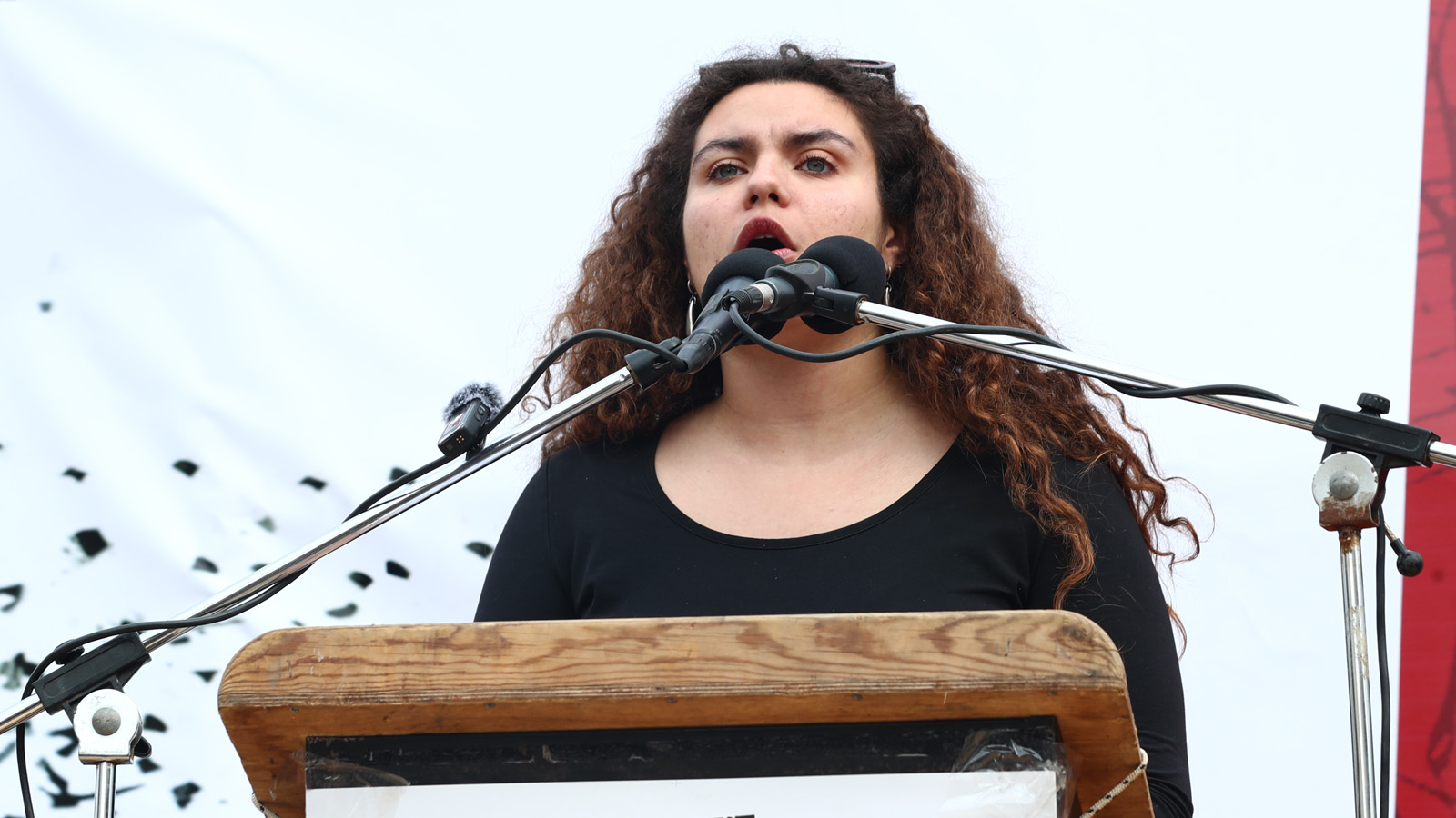 Στο βήμα ανέβηκε επίσης η Σμαρώ Οικού, η αδερφή του Δημήτρη Οικού που σκοτώθηκε στα Τέμπη σε ηλικία μόλις 28 χρονών.