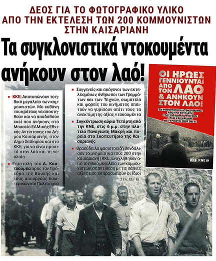 Ολες οι γενιές σμίξανε το απόγευμα της Τετάρτης στην πλατεία «Παναγιώτη Μακρή», στη συγκέντρωση που διοργάνωσε η Οργάνωση Περιοχής Αττικής της ΚΝΕ με αφορμή τις άγνωστες μέχρι σήμερα φωτογραφίες που απεικονίζουν τις τελευταίες στιγμές των 200 κομμουνιστών που εκτελέστηκαν από τους ναζί κατακτητές την Πρωτομαγιά του 1944 και διατρανώνοντας ότι αυτά τα ντοκουμέντα ανήκουν στο λαό.