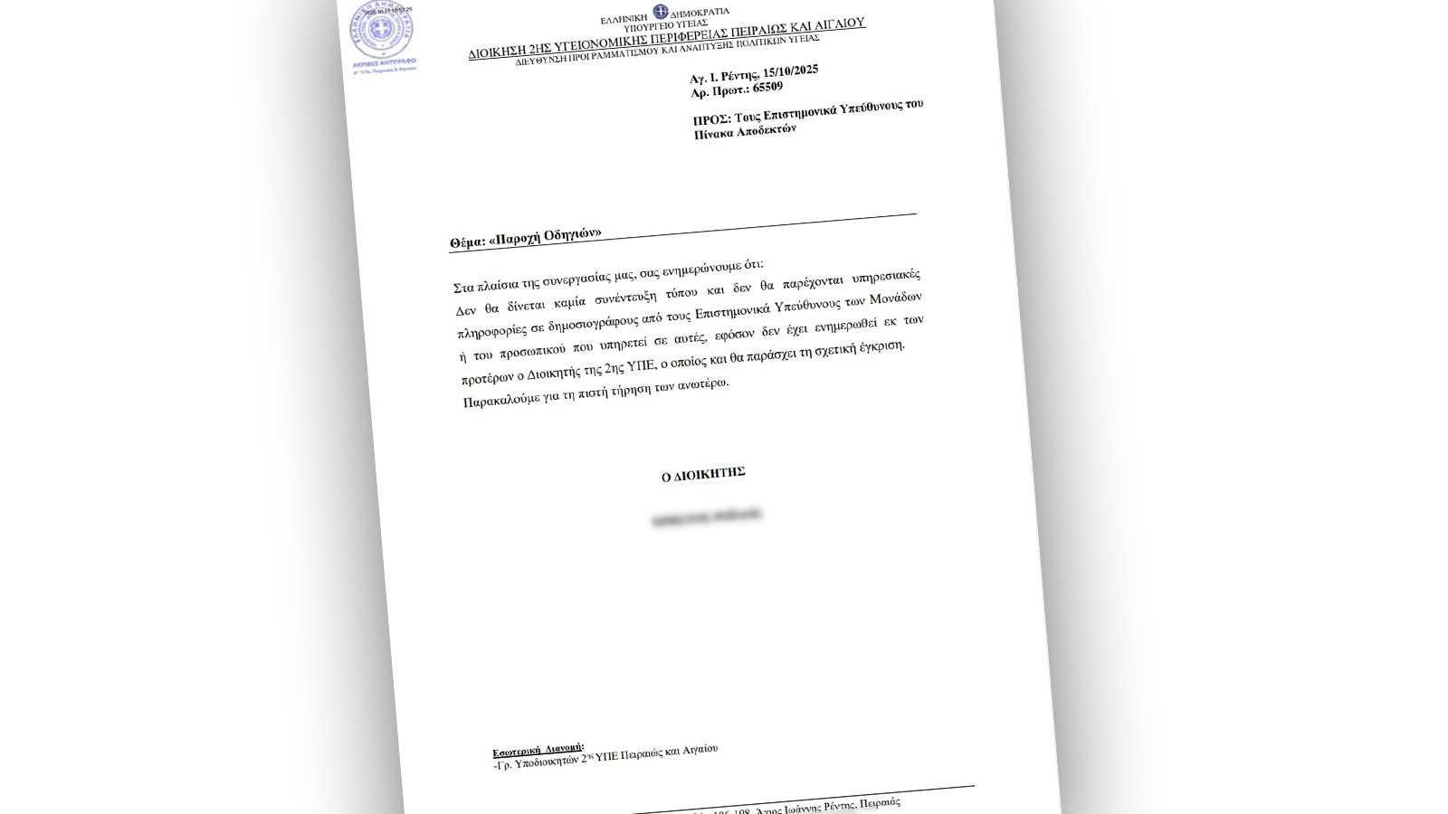 Όπως αναφέρεται στο έγγραφο, το οποίο απευθύνεται «Προς τους επιστημονικά υπεύθυνους του Πίνακα αποδεκτών»: «Σας ενημερώνουμε ότι: Δεν θα δίνεται καμία συνέντευξη τύπου και δεν θα παρέχονται υπηρεσιακές πληροφορίες σε δημοσιογράφους από τους Επιστημονικά Υπεύθυνους των Μονάδων ή του προσωπικού που υπηρετεί σε αυτές, εφόσον δεν έχει ενημερωθεί εν των προττέρων ο Διοικητής της 2ης ΥΠΕ, ο οποίος και θα παράσχει τη σχετική έγκριση. Παρακαλούμε για την πιστή τήρηση των ανωτέρω».