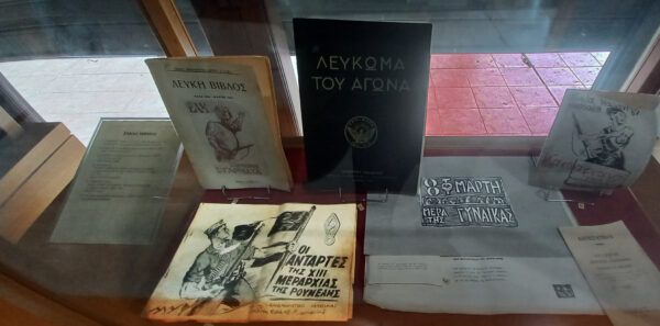 - Στον τοίχο λεύκωμα για την Μέρα της Γυναίκας απ’ τις εργαζόμενες γυναίκες των Ανατολικών Συνοικιών στις 8 Μάρτη του 1946 που εκδόθηκε σε 2.000 αντίτυπα.