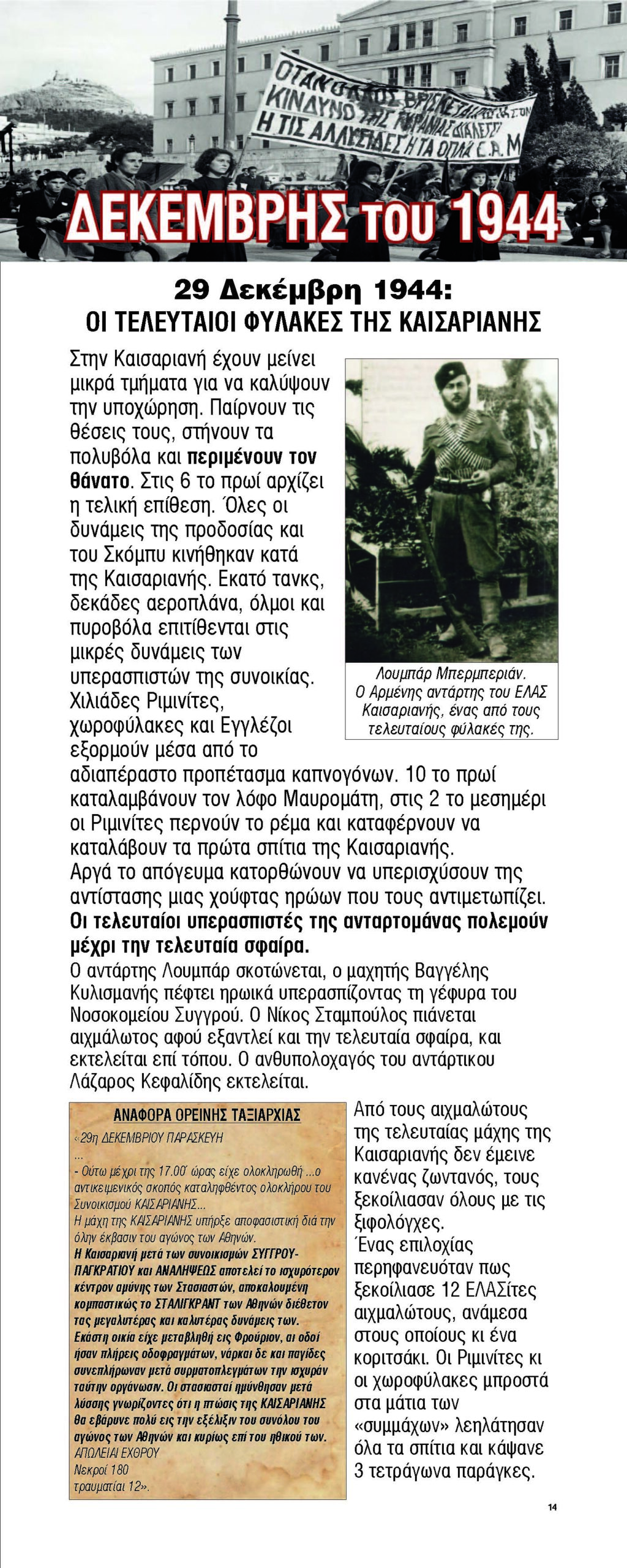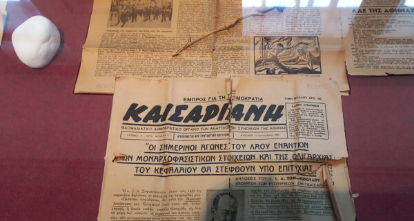 Προθήκη 1ης ενότητας με πρωτότυπα φύλλα της εφημερίδας ΚΑΙΣΑΡΙΑΝΗΣ και του ΡΙΖΟΣΠΑΣΤΗ με ρεπορτάζ από τα γεγονότα της εποχής.