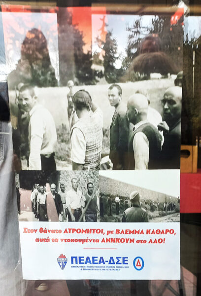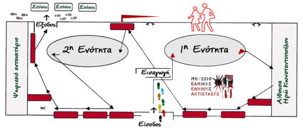 Ακολουθήστε από δεξιά προς τα αριστερά, διαμέσου των τυπωμένων ταμπλό που κρέμονται ως παράθυρα στην ιστορική μνήμη, τις 2 θεματικές ενότητες με πλούσιο φωτογραφικό υλικό και πλήθος ιστορικών πηγών. Πρώτα από όλα διαβάστε τα 2 ταμπλό που βρίσκονται δεξιά της εισόδου και είναι απαραίτητα για την κατανόηση της ιστορία που θα ακολουθήσει.