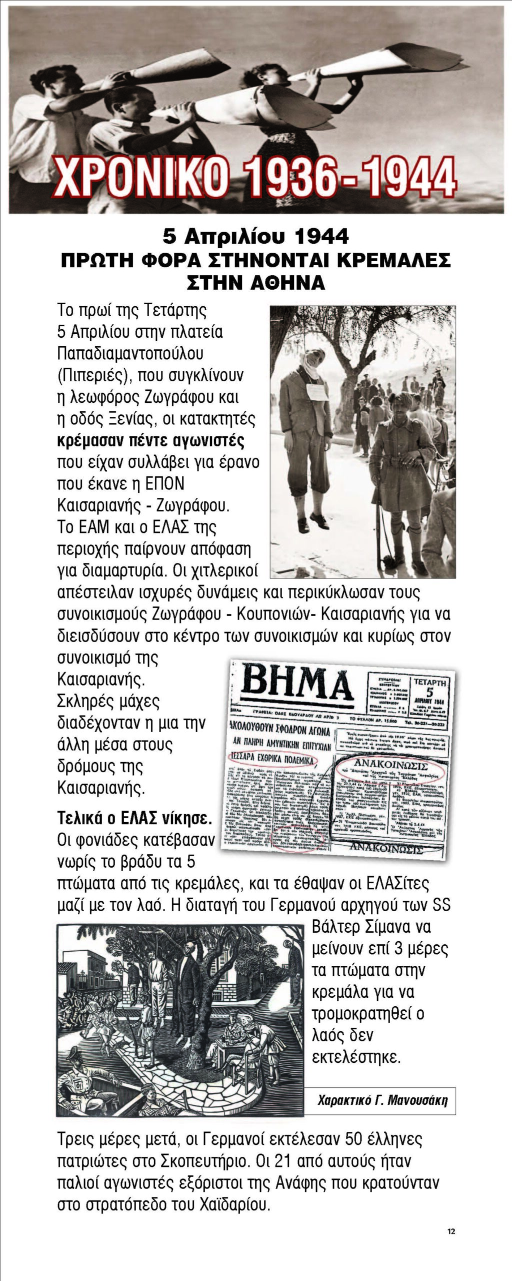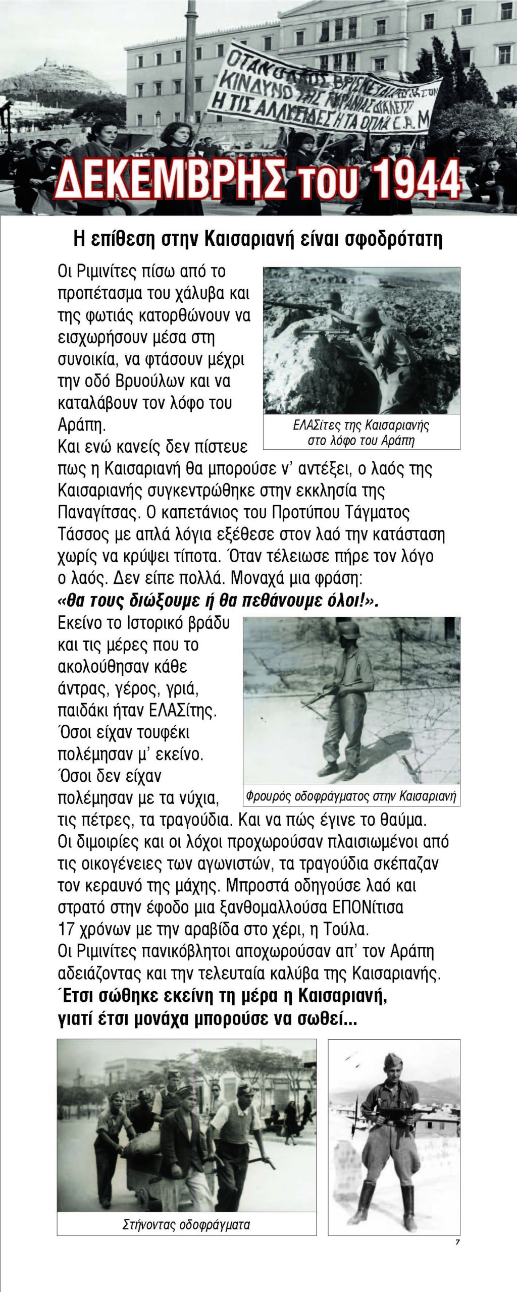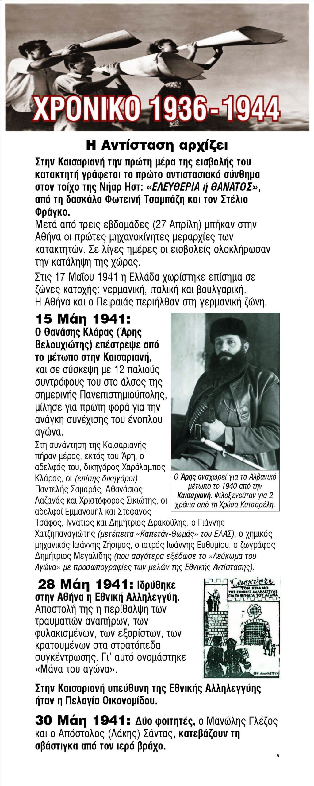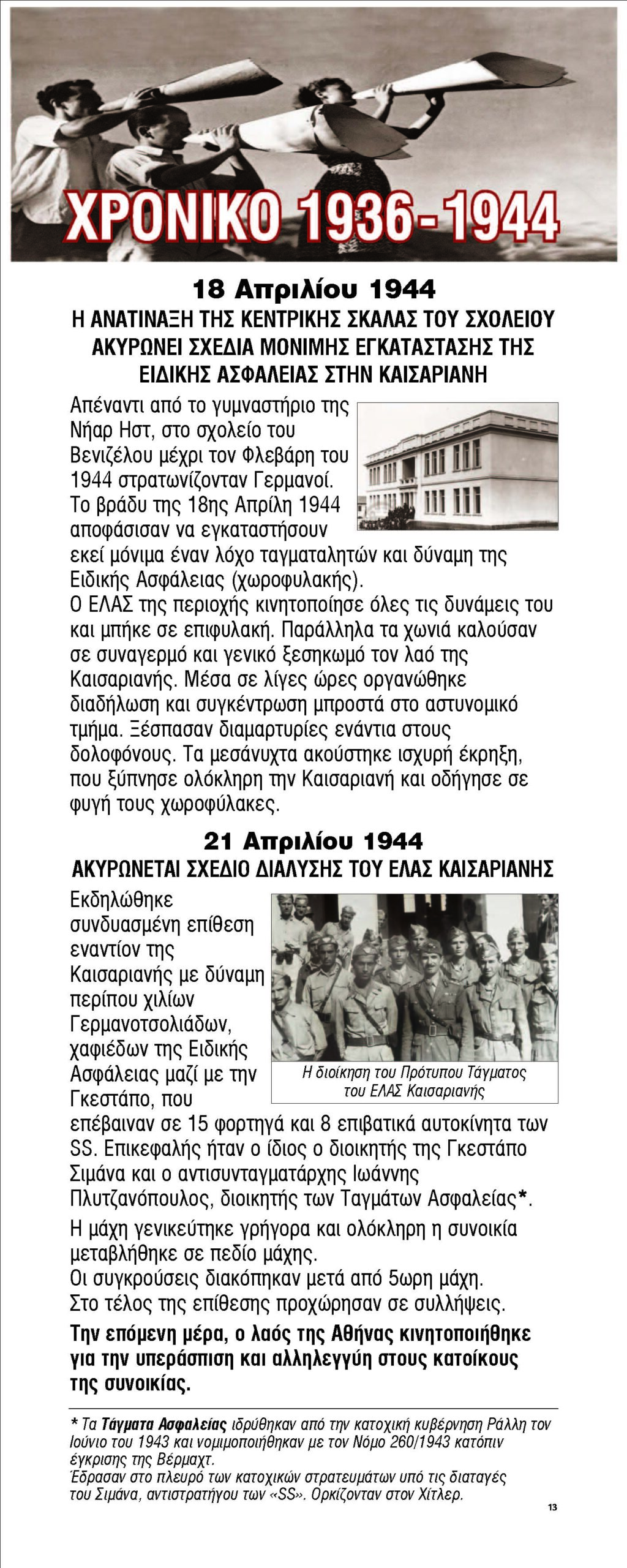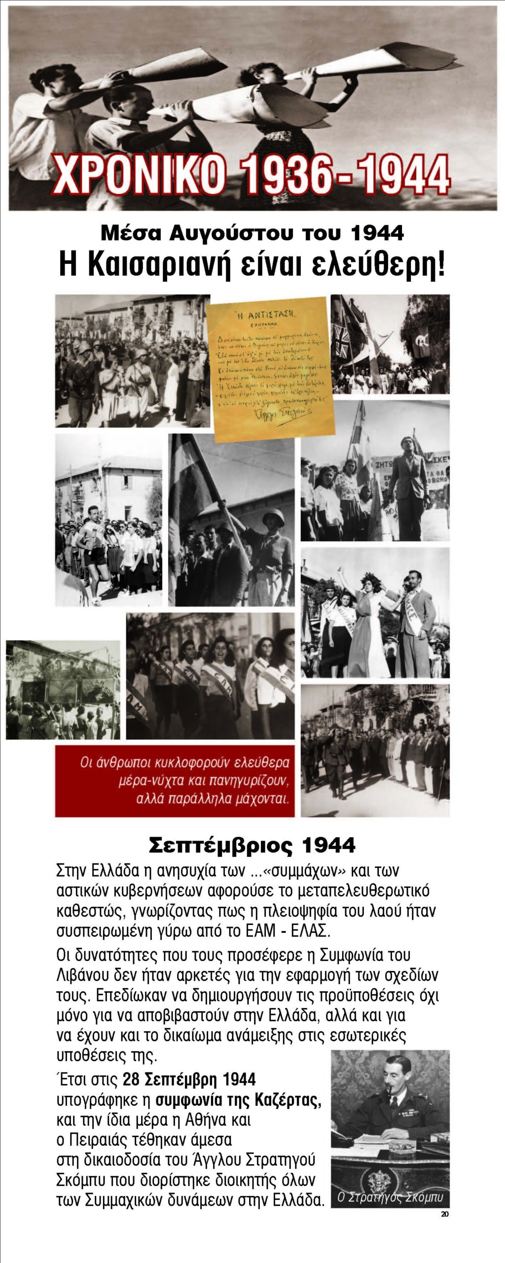 Ο φασισμός εξαπλώνεται στην Ευρώπη χάρη στη στήριξη μεγάλων οικονομικών ομίλων, η Ελλάδα υπό κατοχή, ο λαός οργανώνει την αντίστασή του, ιδρύεται το ΕΑΜ, η Καισαριανή γίνεται απάτητο κάστρο του αγώνα, η απελευθέρωση της Καισαριανής τον Αύγουστο του 1944, σχεδόν 2 μήνες πριν την απελευθέρωση της Αθήνας.