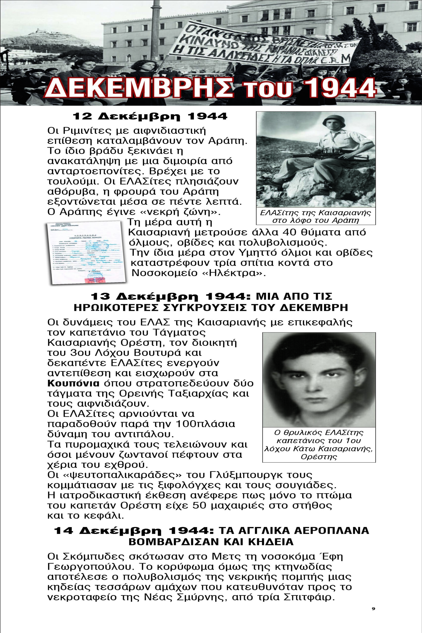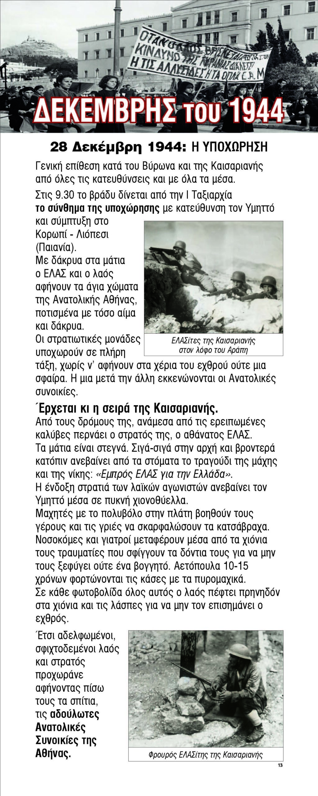 2η ενότητα/ Δεκέμβρης 1944: Αριστερά της εισόδου: Απελευθέρωση της Αθήνας. Ο λαός ζητά κοινωνική δικαιοσύνη και τιμωρία των δοσίλογων. Οι «σύμμαχοί» μας με προεξέχοντες του Άγγλους τσακίζουν το λαό. Επιθυμούν μια Ελλάδα στη σφαίρα επιρροής τους. Ζητούν τον αφοπλισμό του ΕΑΜ. Πνίγουν την Αθήνα στο αίμα και ξεκινά ο μαύρος Δεκέμβρης του 1944. Οι άνισες μάχες οδηγούν στην υποχώρηση τους ΕΛΑΣ από την Αθήνα, το Γενάρη του 1945. Μετά την υποχώρηση όλη η λύσσα των μοναρχοφασιστών , πέφτει πάνω στις Ανατολικές Συνοικίες, 1050 κάτοικοι σε στρατόπεδα συγκέντρωσης στην Ελ Ντάμπα Αιγύπτου, εξορίες και διωγμοί.