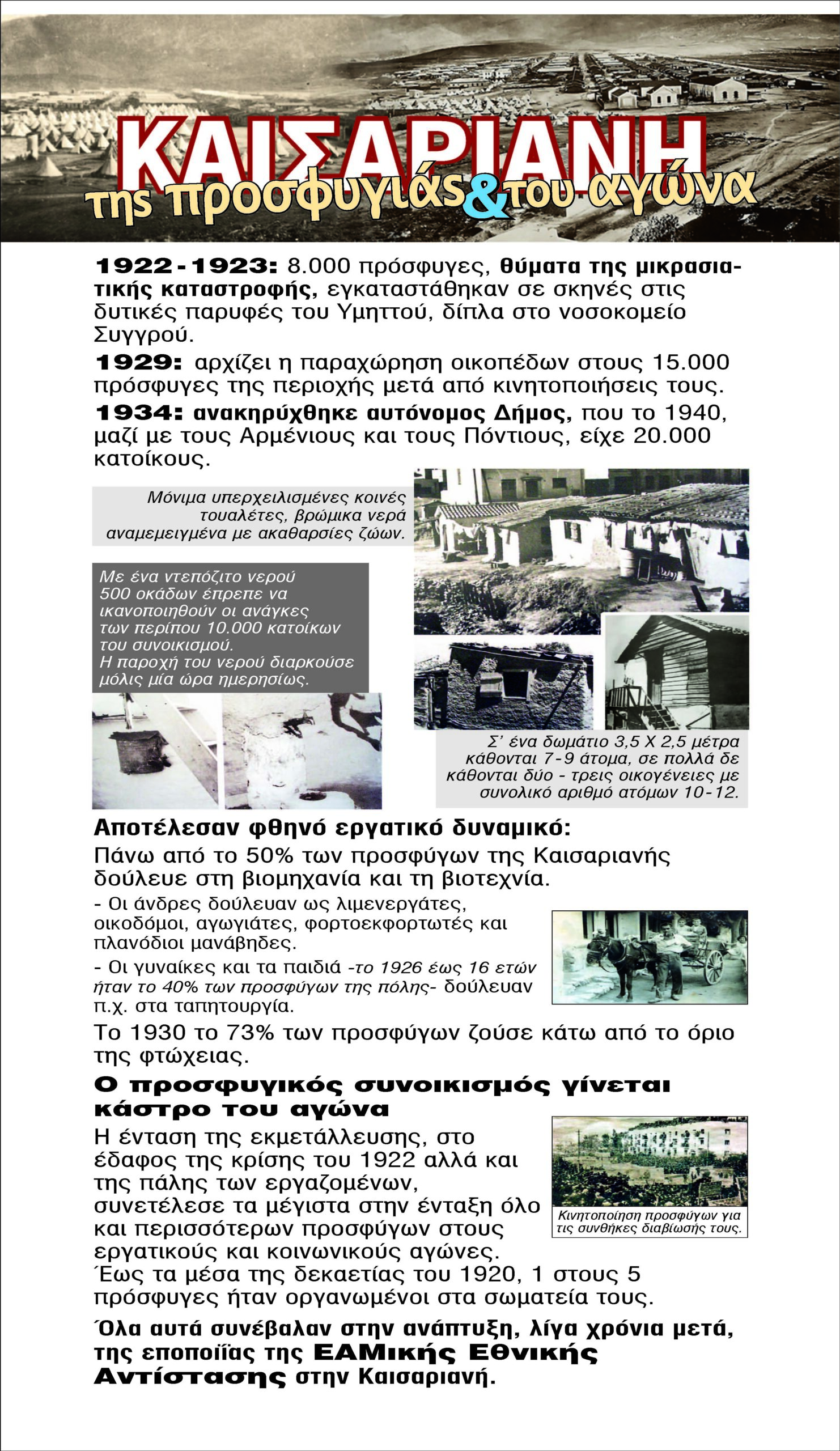 Οι δεκάδες χιλιάδες πρόσφυγες που εγκαταστάθηκαν σε σκηνές στον έρημο βοσκότοπο πίσω από το νοσοκομείο του Συγγρού τον Σεπτέμβρη του 1922, θύματα της Μικρασιατικής Καταστροφής, δεν είχαν άλλο δρόμο από τον αγώνα για επιβίωση, για αξιοπρέπεια, για λευτεριά.