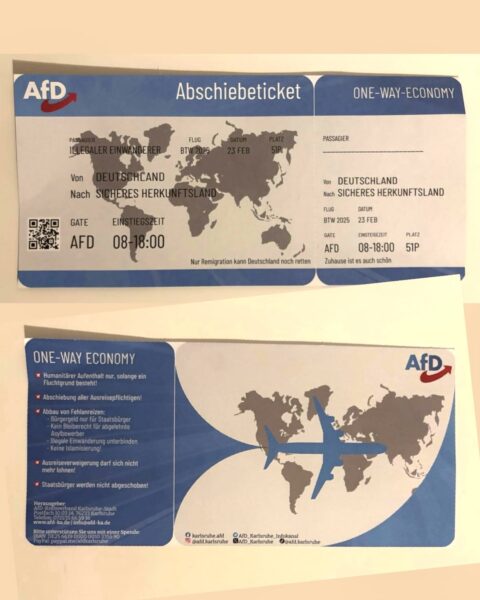 Το φυλλάδιο – «εισιτήριο χωρίς επιστροφή» φέρει ως ημερομηνία την ημέρα των εκλογών, 23 Φεβρουαρίου 2025 και ως προορισμό «ασφαλή χώρα προέλευσης». Ο κωδικός QR στο χαρτί παραπέμπει στον ιστότοπο της τοπικής οργάνωσης της AfD. Σύμφωνα με ρεπορτάζ του δημόσιου δικτύου SWR, μετανάστες βρήκαν το φυλλάδιο στο γραμματοκιβώτιό τους, ενώ το κόμμα το δημοσίευσε ως διαφημιστικό προεκλογικό υλικό σε πλατφόρμες κοινωνικής δικτύωσης.