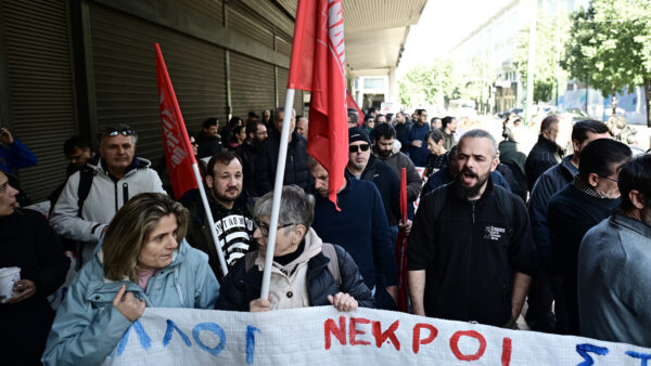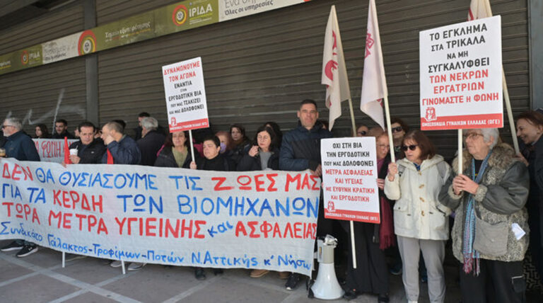 Ως εδώ! Όχι άλλο αίμα εργατών για τα κέρδη των εργοδοτών» το μήνυμα που στέλνει η απεργιακή συγκέντρωση των εργαζομένων στον κλάδο των Τροφίμων και Ποτών έξω από το υπουργείο Εργασίας. Η απεργιακή μάχη που προκηρύχτηκε από την Ομοσπονδία Εργαζομένων σε Γάλα – Τρόφιμα – Ποτά μετά το στυγνό εργοδοτικό έγκλημα στο μπισκοτάδικο στα Τρίκαλα είναι σε εξέλιξη από τα χαράματα.