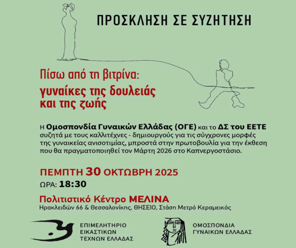 Η Ομοσπονδία Γυναικών Ελλάδας (ΟΓΕ) και το ΔΣ του ΕΕΤΕ συζητά με τους καλλιτέχνες – δημιουργούς για τις σύγχρονες μορφές της γυναικείας ανισοτιμίας, μπροστά στην πρωτοβουλία για την έκθεση που θα πραγματοποιηθεί τον Μάρτη 2026 στο Καπνεργοστάσιο.
